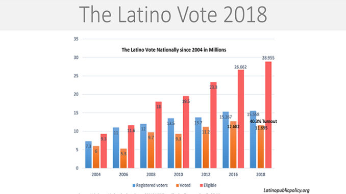These are the New Census Bureau data results from the 2018 Mid-Term Voting and Registration among Latino voters that were released this week. These are charts for all the six states in the Southwest where most Latinos reside; the charts include the total population of Latinos, citizens voting age populations, registered voters, and actual turnout. The pie charts on the right show the share of the Latino Vote in every state and other racial groups.