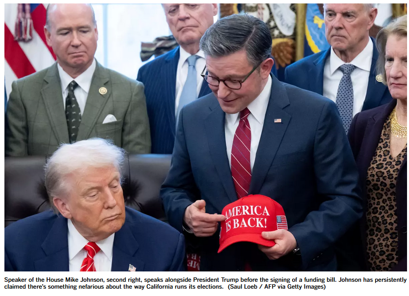 House Speaker Mike Johnson continues to perpetuate falsehoods about California elections, though he should know better. False claims further President Trump’s aim to sow doubts about the midterm election.